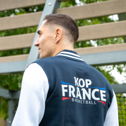Manches montées contrastées. Fermeture devant par boutons pression contrastés. Bord-côtes avec 2 liserés contrastés au col, manches et bas de vêtement. 2 poches passepoilées contrastées devant. Bande de propreté en chevron et boucle d'accrochage à l'intérieur col.
